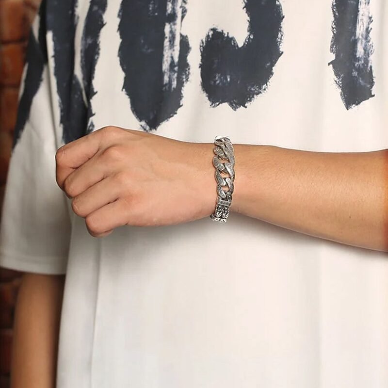 A trama complexa dos elos, combinada com o fecho seguro e detalhado, resulta em uma peça de presença marcante.