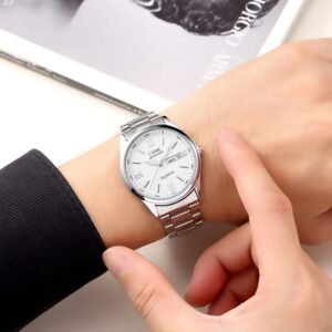 O prático mostrador exibe o dia da semana e a data, unindo conveniência e um visual refinado.